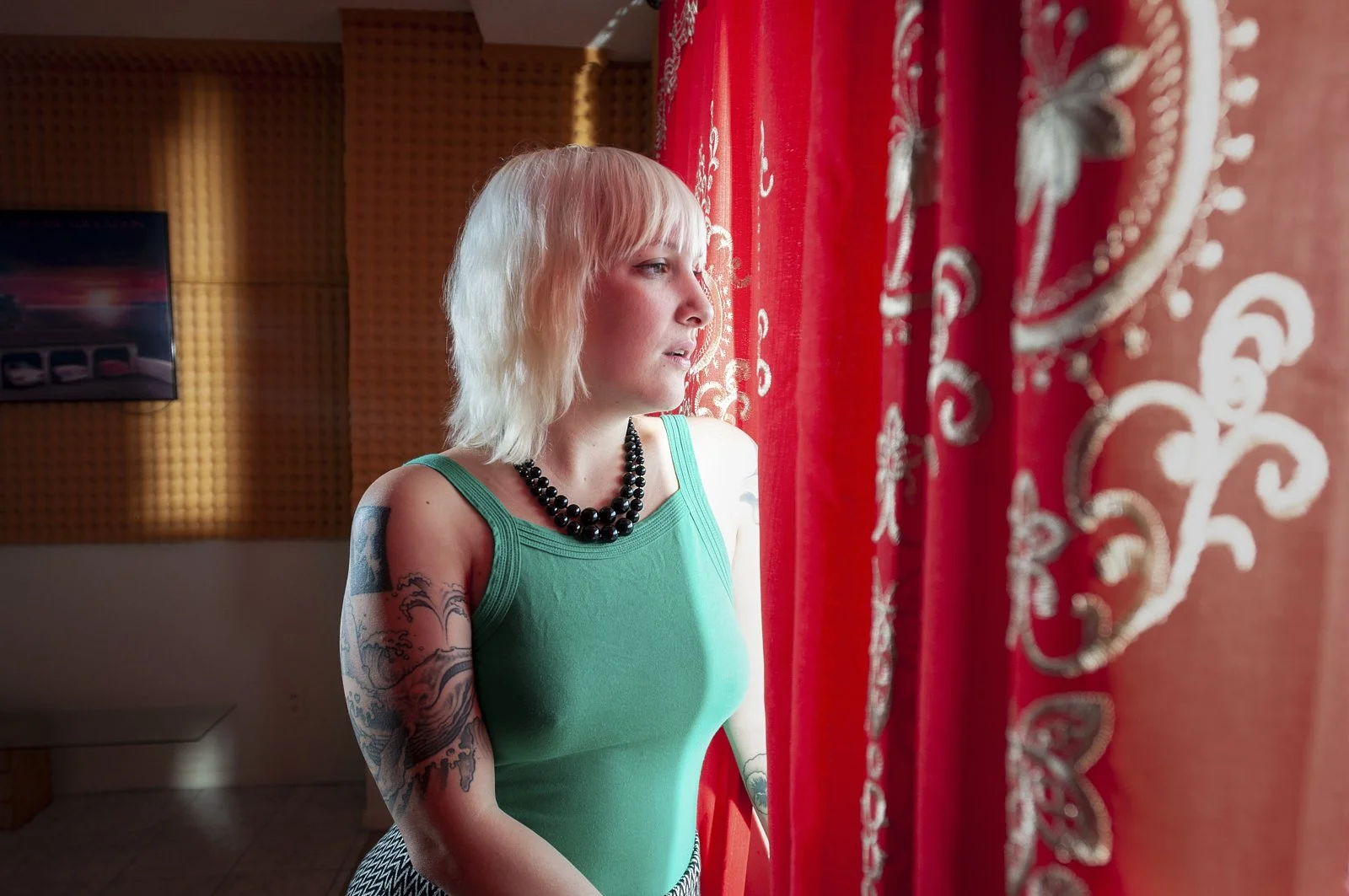 Portrait of a woman with short hair, wearing a red off-shoulder dress with floral sleeves and large striped earrings, standing against a yellow background with shadow of leaves.