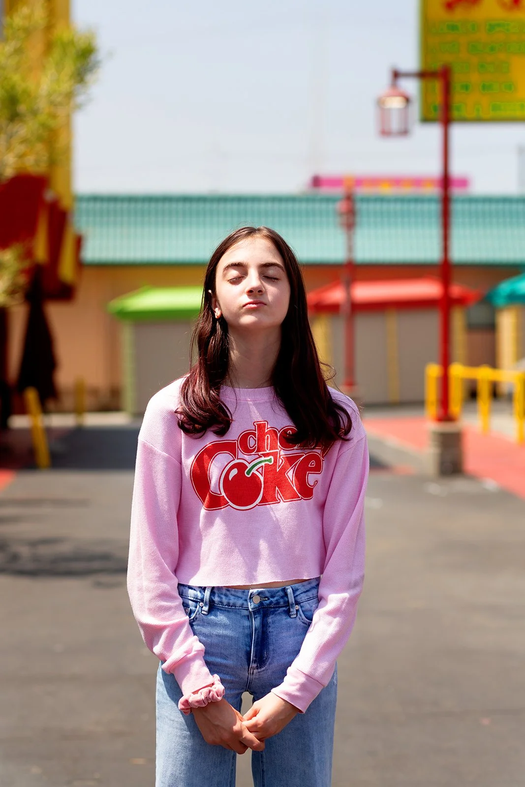 A young woman with blonde hair wearing a purple Subway shirt standing next to a black car outside a fast-food restaurant during sunset.