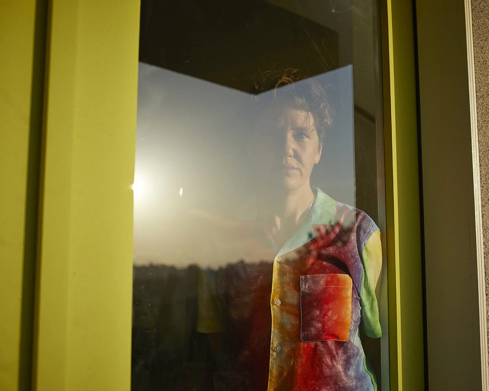 A young woman with brown hair resting her head on a windowsill, gazing outside at green trees, with her reflection visible in the window.